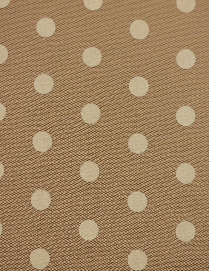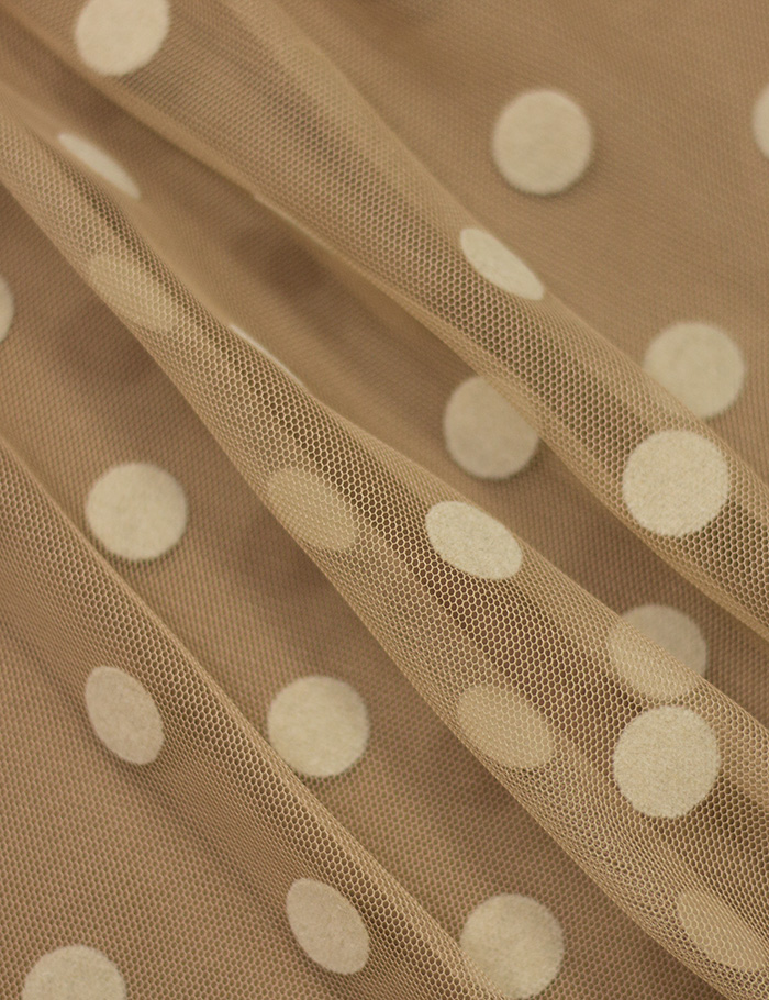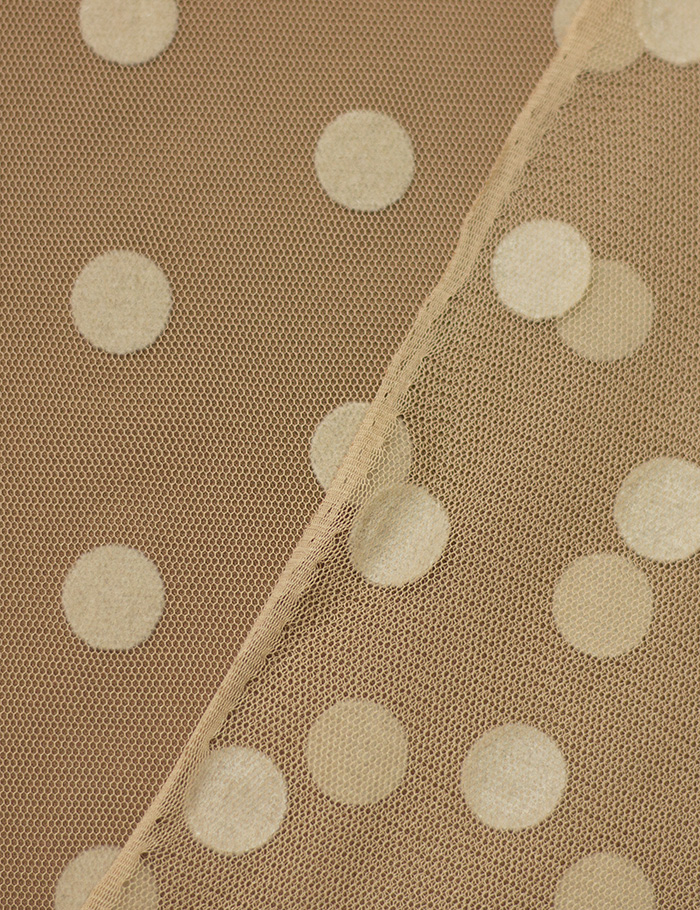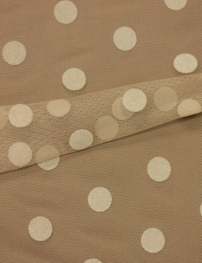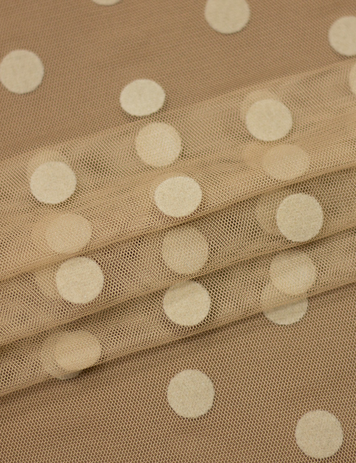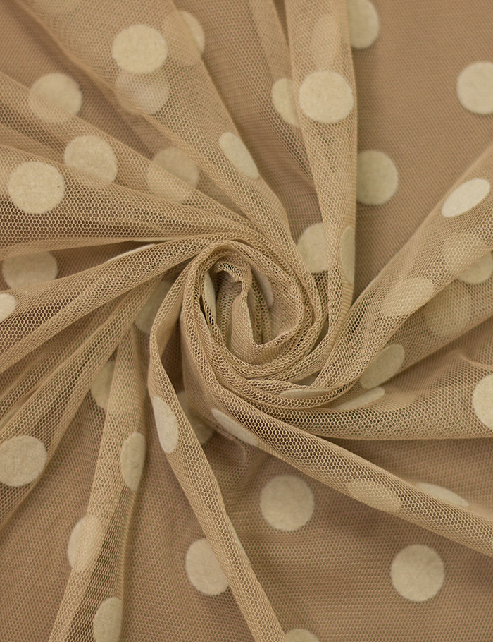 Тонкая эластичная и полупрозрачная сетка с нежным принтом - горох. Лицевая сторона представляет собой сетчатую поверхность с мягким рельефным рисунком, имитирующим бархат. Применяется для декорирования деталей одежды, а так же для изготовления спортивных и танцевальных костюмов, нарядной и повседневной одежды.